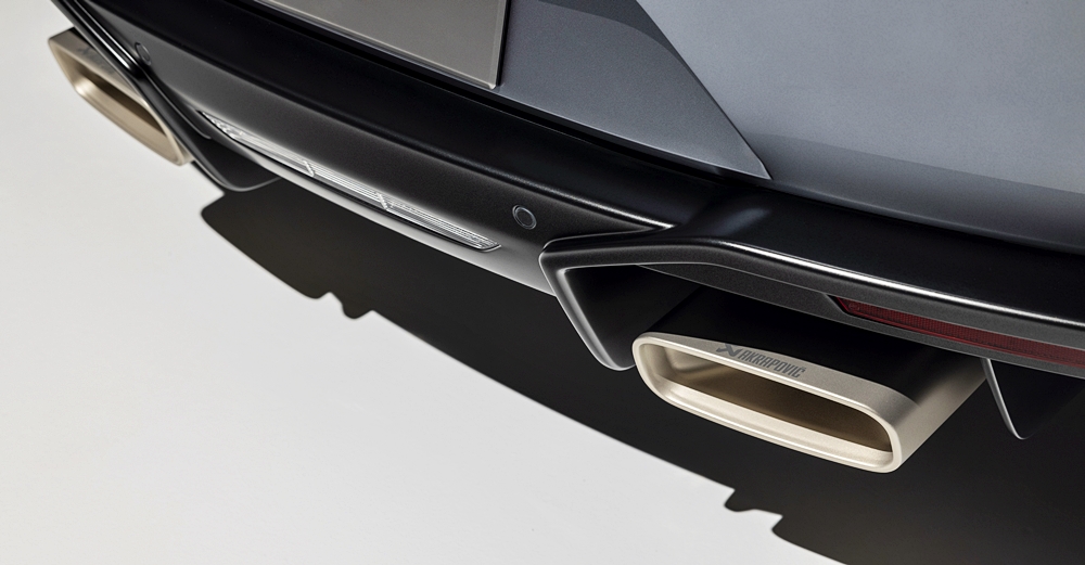 Bagi mendapatkan deruman bunyi lebih garang, pelanggan ditawarkan sistem ekzos titanium dengan injap aktif. Semua kuasa enjin dihantar ke roda belakang melalui aci pacu (driveshaft) gentian karbon dan transmisi dual-klac (DCT) 8-kelajuan pada gandar belakang (rear transaxle) untuk nisbah 50:50 depan dan belakang.