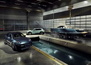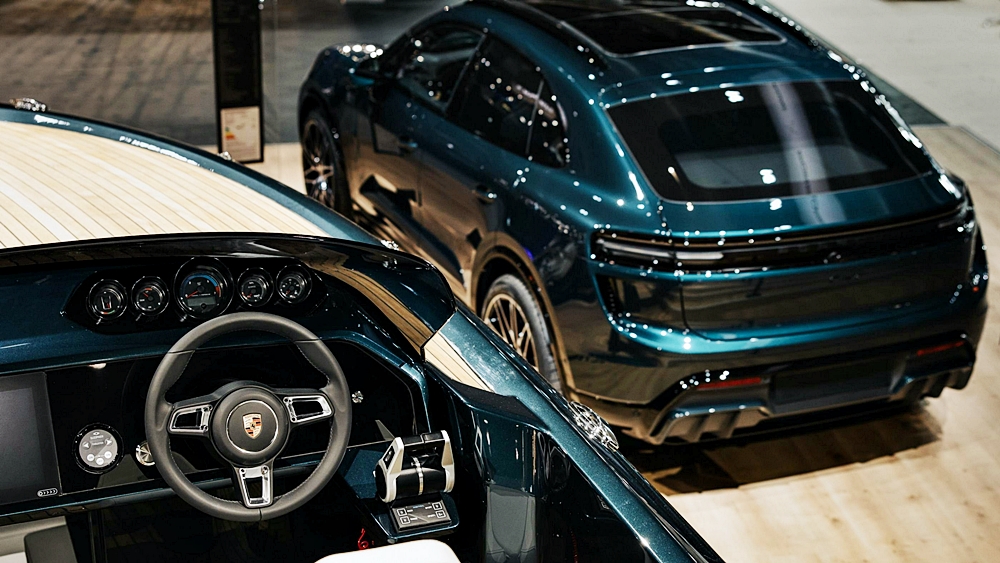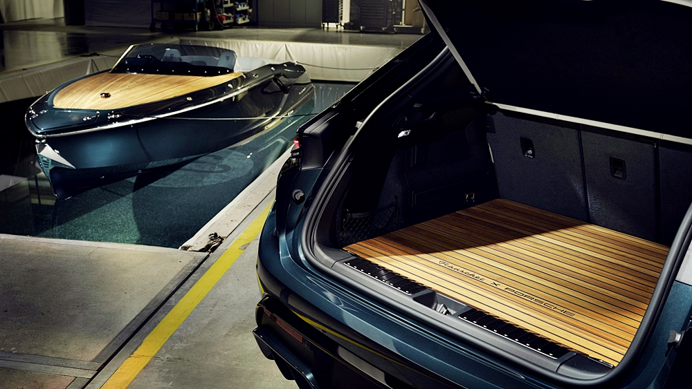 Kedua-dua bot dan SUV disiapkan dalam warna cat eksklusif Darkteal Metallic yang diambil daripada program Paint to Sample Porsche.