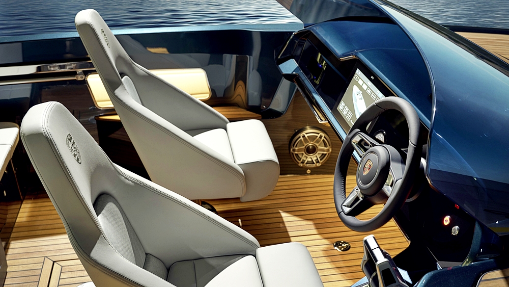 Ruang kabin bot Frauscher 790 Spectre membawakan banyak elemen daripada kereta sport Porsche.