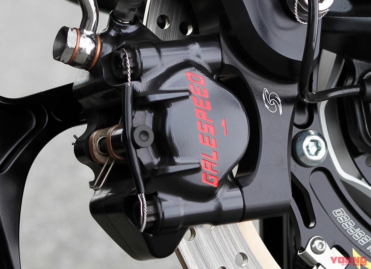 Kaliper brek radial 2-piston untuk roda depan memiliki struktur 2-unit potongan 3D dengan material tempa. Piston aluminium disadur Kashima untuk lebih kuat dan lasak. Bahagian bolt lebih tebal 60mm dalam dua jenis, SCM dan titanium. Harga 68,200 yen (RM2,680).