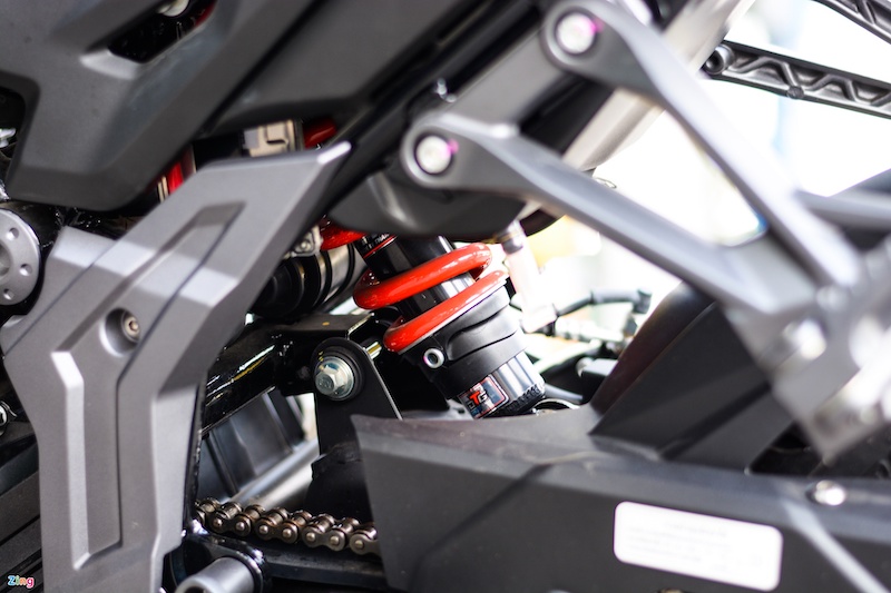 - Menggunakan sistem fork terbalik (USD) KYB emas di depan, dan monoshock YSS di belakang. Tiada ciri boleh laras ditawarkan.