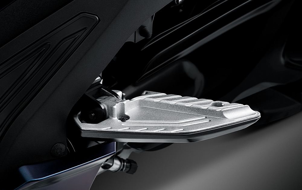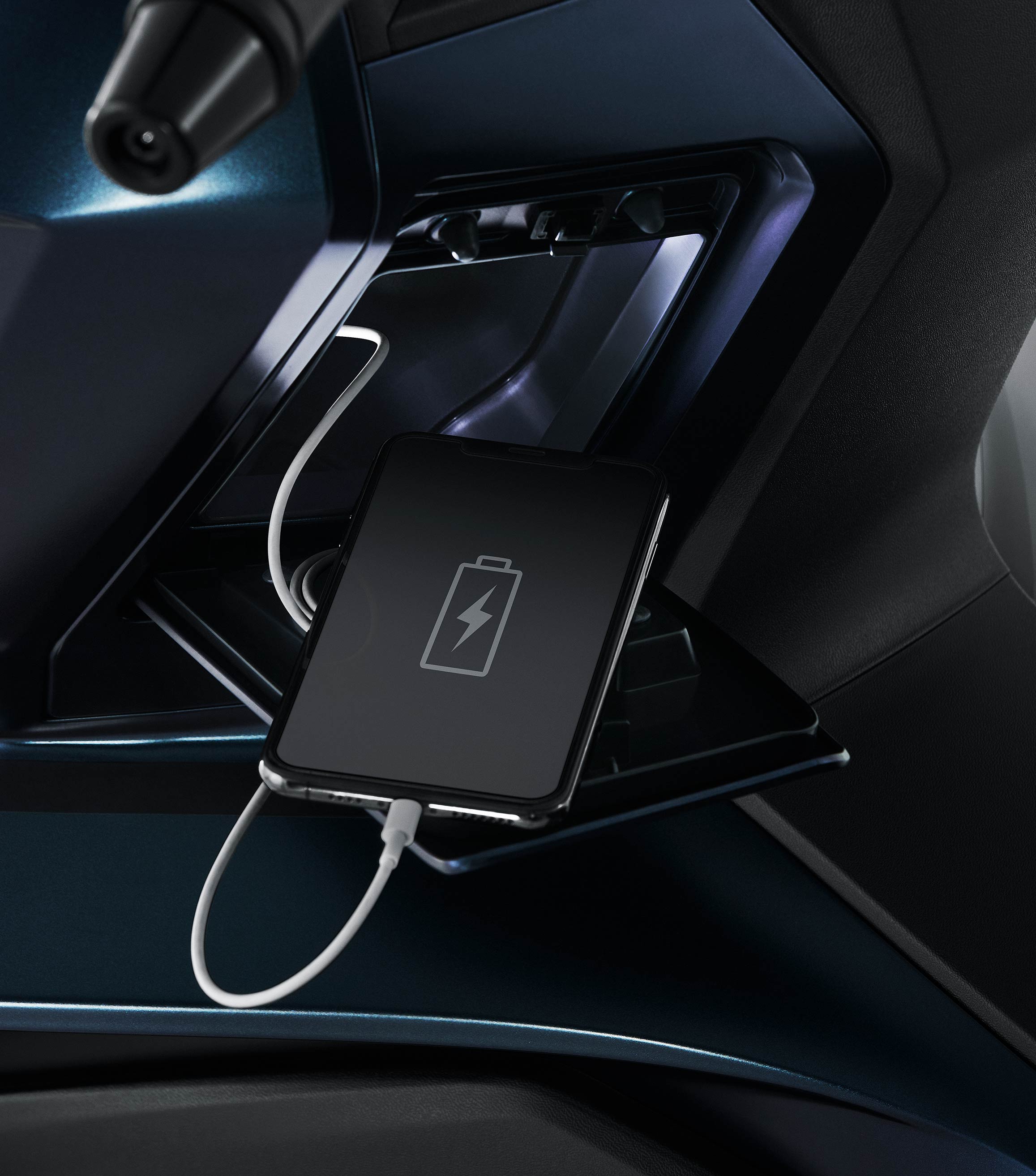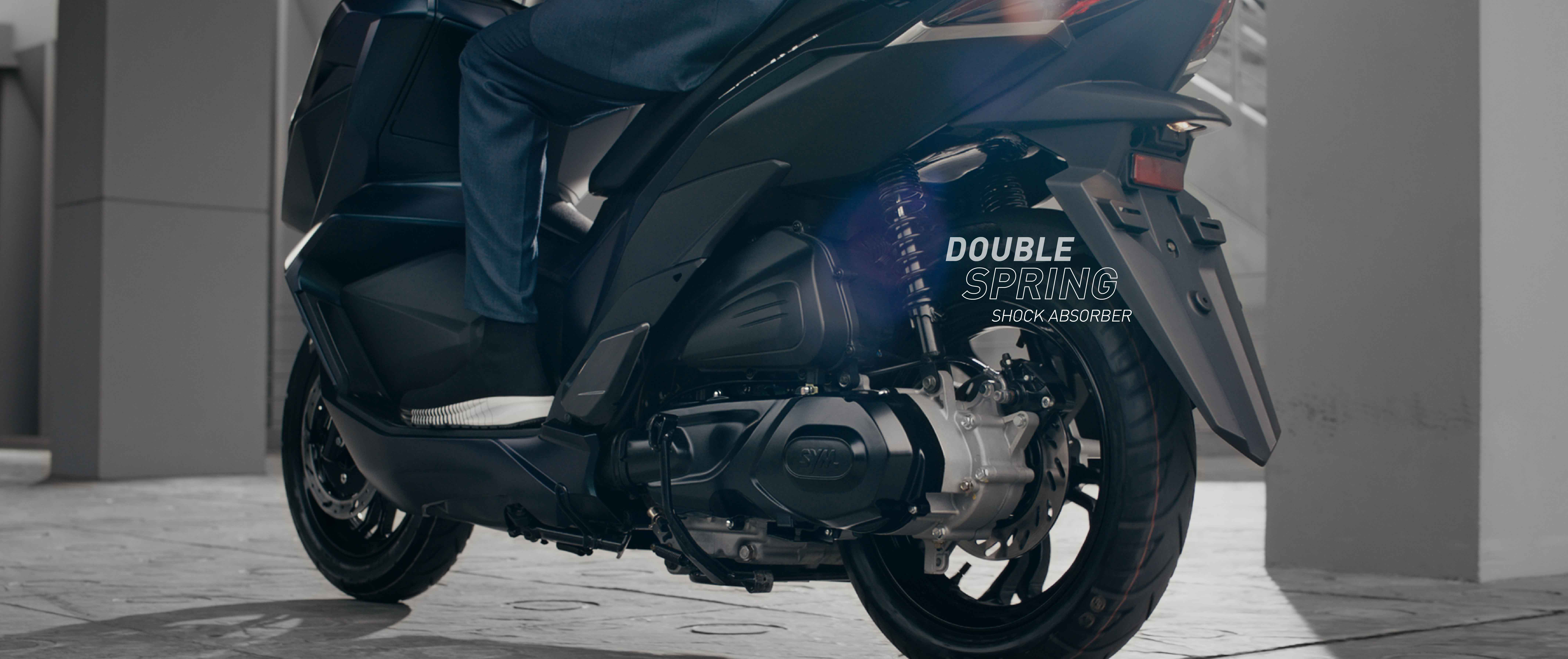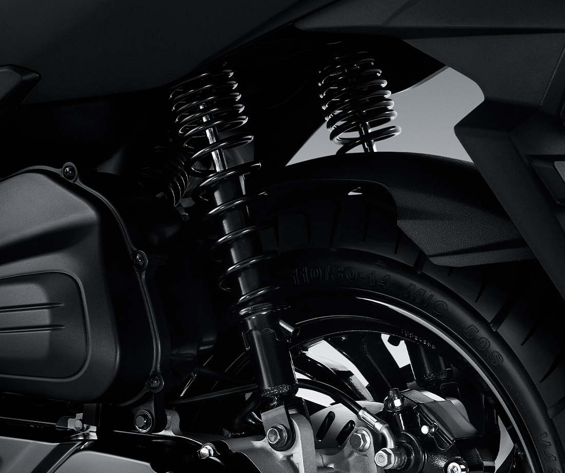 Sistem suspensi menggunakan fork teleskopik di depan dan absrober kembar boleh laras 3-tetapan di belakang. Ciri tambahan disediakan ialah palam USB untuk mengecas telefon pintar.