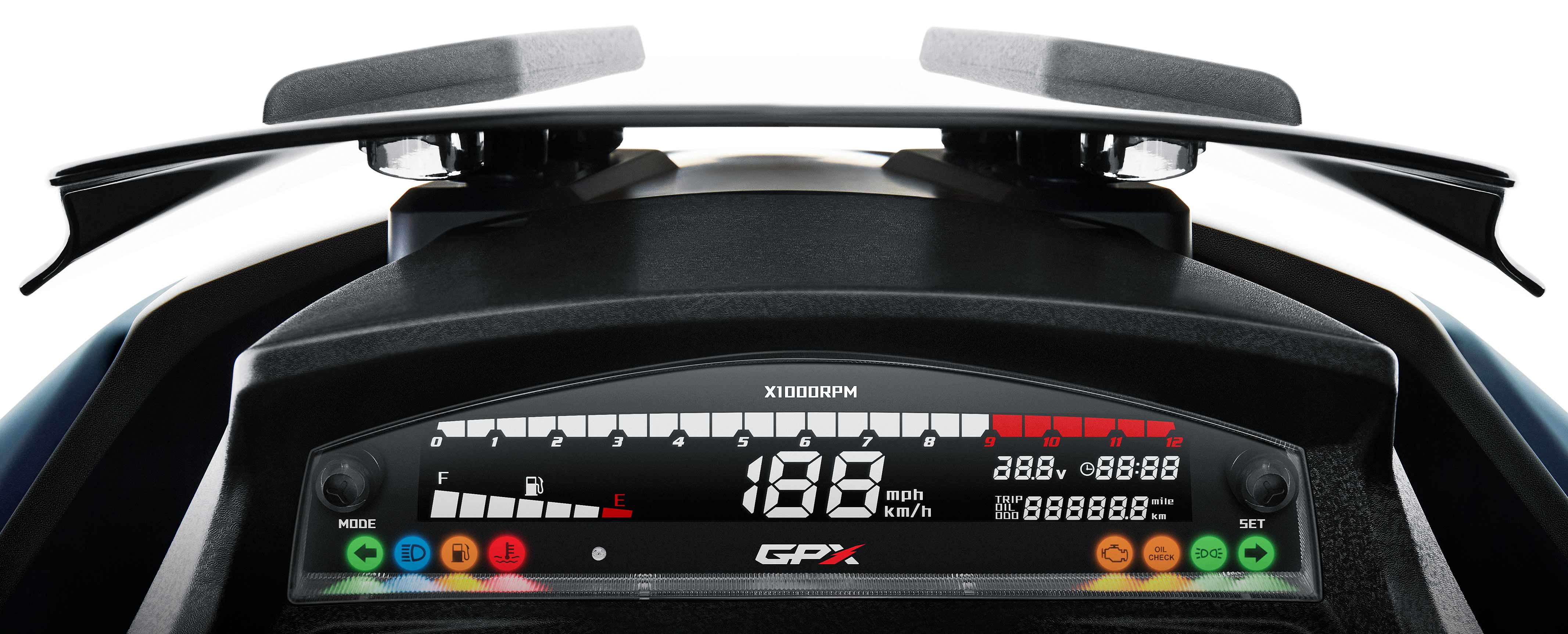 Bahagian pemuka menampilkan kluster instrumen digital LCD penuh dalam bentuk horizontal yang melengkung di atas. Ada bar minyak, spidometer, lampu signal kiri dan kanan, indikator voltan bateri, jam, dan odometer dalam ukuran batu atau kilometer. Paling luar biasa, ada takometer dan lampu kecemasan.