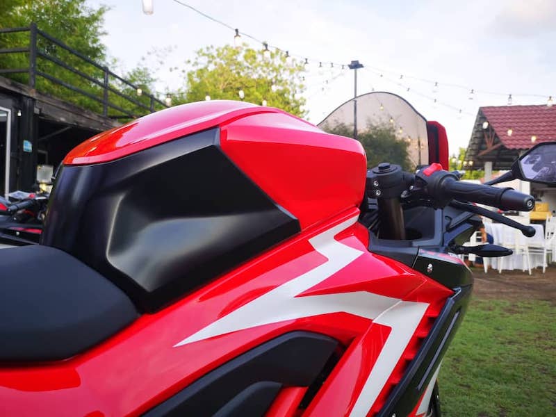 - Menampilkan pelana gaya sport jenis terpisah antara penunggang dan pembonceng. Tinggi pelana 815mm, manakala berat motosikal 155kg. Jarak roda pula 1,350mm.