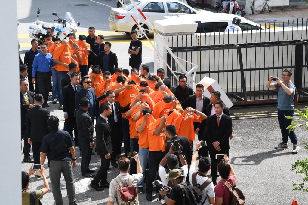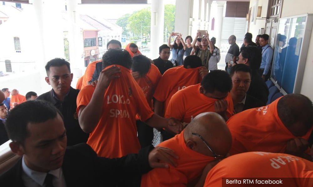 Seramai 30 lelaki tiba di Kompleks Mahkamah Pulau Pinang jam 10.40 pagi dengan diiringi lebih 10 pegawai SPRM. Semalam, 33 individu ditahan, termasuk 24 penguat kuasa JPJ sebelum tiga wanita dibebaskan atas jaminan SPRM hari ini, lapor HMetro.