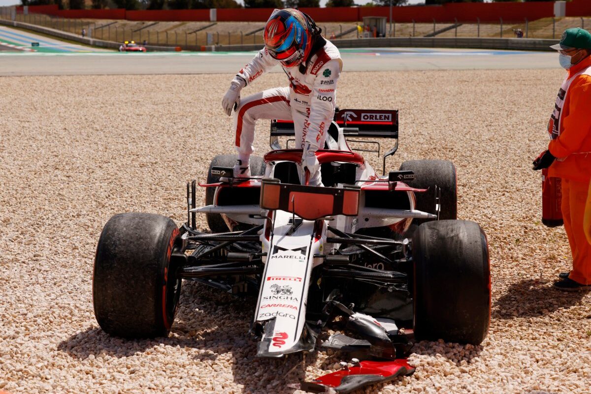 Serpihan sayap depan kereta yang berserakan membuatkan kereta keselamatan terpaksa turun trek. Itu saja aksi kemalangan dan penyingkiran yang berlaku sepanjang GP Portugal. Adakah Raikkonen sedang termenung sebelum terlanggar jentera rakan sendiri?