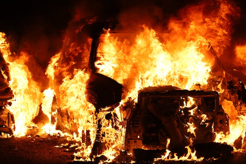 Foto dikongsi Jabatan Bomba Indianapolis memaparkan sebuah Chrysler 200, minivan generasi keempat Chrysler, model generasi akhir Kia Soul, Jeep Renegade dan Mercedes-Benz E-Class rosak terbakar.