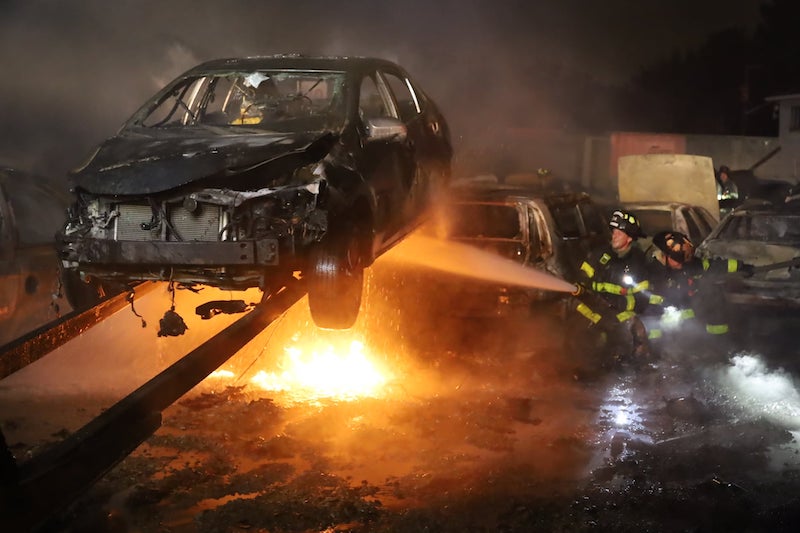 Anggita bomba mengambil masa kira-kira dua jam untuk mengawal kebakaran di kawasan lot milik Insurance Auto Auctions di 3202 South Harding Street. Bomba tiba di lokasi kejadian jam 1.46 pagi dan mengawal api kira-kira jam 3.26 pagi (waktu tempatan).