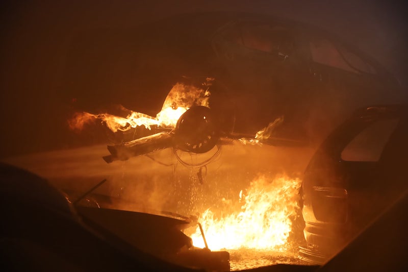 Sekumpulan anggota bomba memanjat tangga dan membuat semburan air dari atas untuk memadamkan kebakaran. Pada masa sama, beberapa trak angkat susun (forklift) mengangkat kereta terbakar dan membantu memindahkan kenderaan lain untuk menyelamatkan daripada terbakar.
