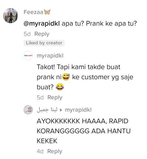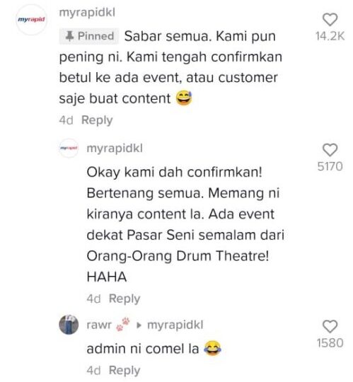 Beberapa netizan pula pantas bertanyakan perihal wanita misteri itu kepada MyRapidKL di TikTok. Percayakah anda, MyRapidKL sendiri pun terkejut dengan insiden tersetut. Berikut respons mereka;