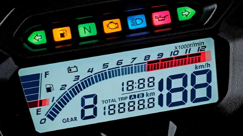 - Panel meter digital LCD dengan paparan spidometer, takometer, odometer, trip perjalanan, posisi gear, jam, indikator bateri dan paras petrol.