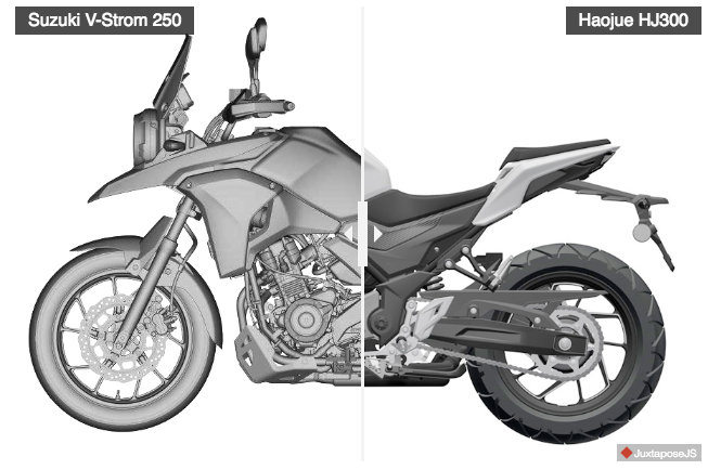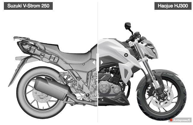 Cuba bandingkan gambarajah Suzuki V-Strom 250 dan Haojue (HJ300) di bawah. Kontras warna turut diselaraskan untuk kedua-dua model itu bagi mengesan persamaan rekabentuk kedua-dua jentera. Lihat sisi kanan dua motosikal tersebut yang menampilkan bentuk sama, tetapi jentera Haojue lebih bulat di depan penutup minyak enjin di depan, seakan tanda aci imbang.