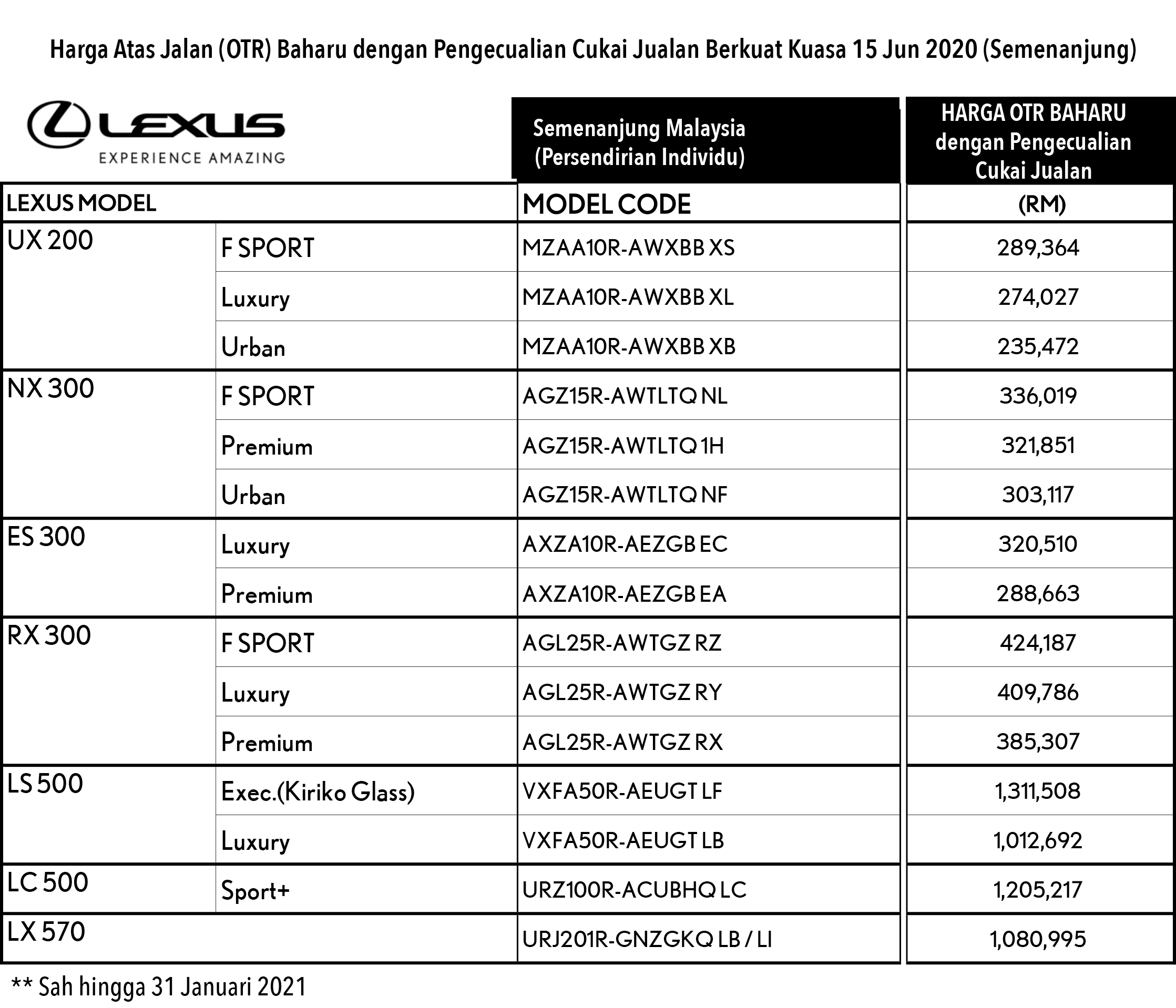 PENGEDAR rasmi kenderaan Toyota dan Lexus di Malaysia, UMW Toyota Motor Sdn Bhd (UMWT) hari ini mengumumkan harga baharu tanpa cukai jualan untuk dua jenama itu berkuat kuasa 15 Jun ini.