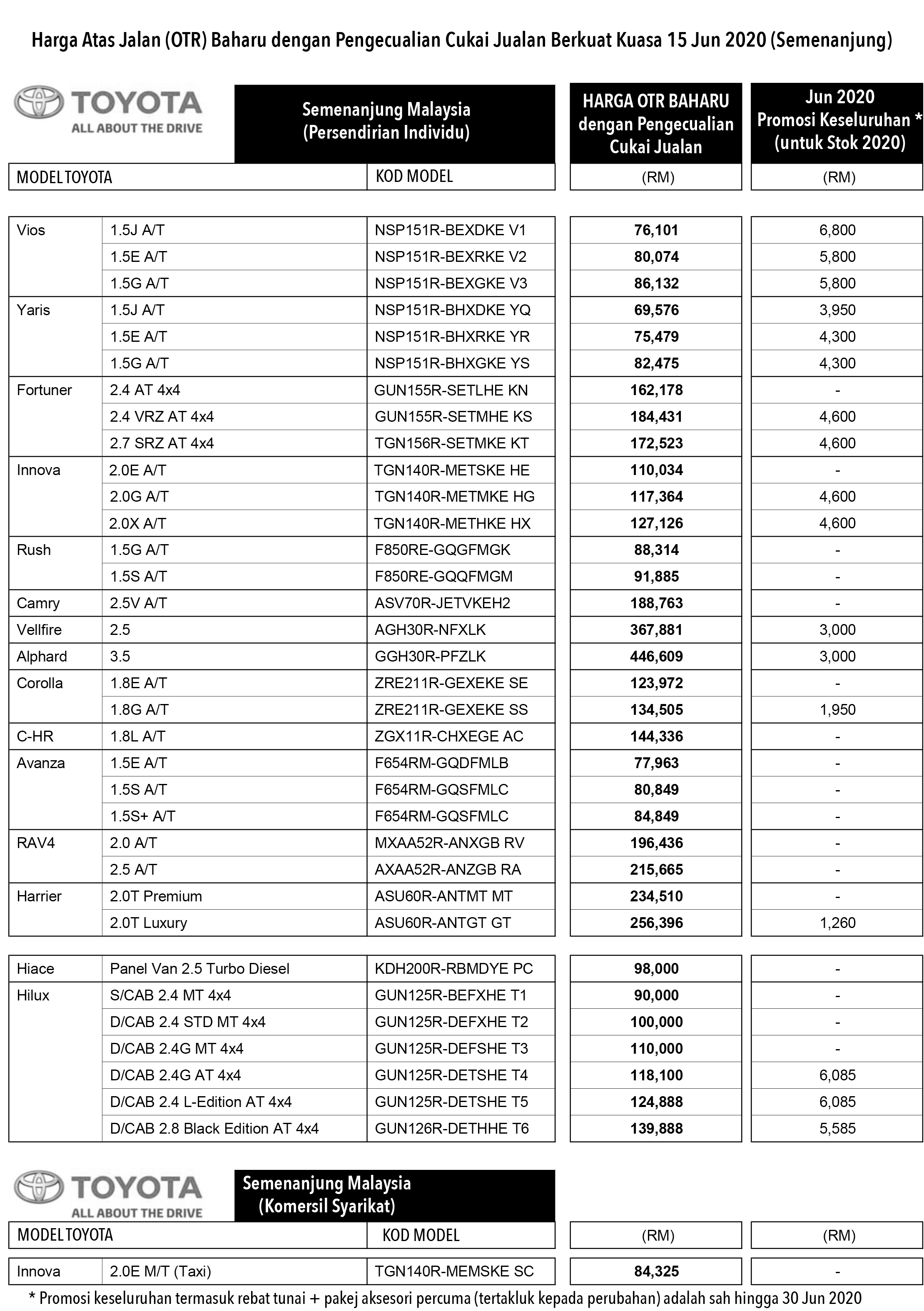 Harga kenderaan Toyota kini dikurangkan antara 1 hingga 6 peratus, dan Sebagai tambahan, Toyota turut mengumumkan harga baharu itu dengan kempen bulanan terkini ‘Rebat dan Promosi Jualan’.