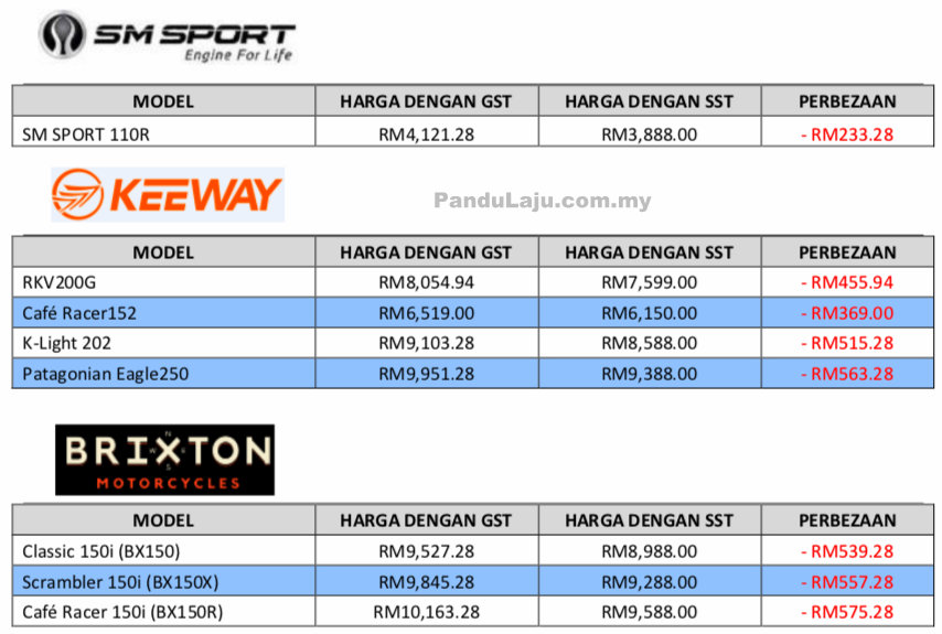 Berikut harga baru dengan SST untuk jenama Benelli, Keeway, SMSport dan Brixton;