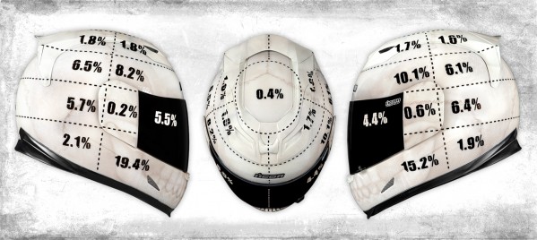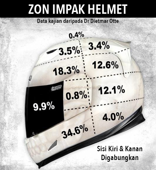 Faktanya, kajian di bawah ini menunjukkan purata agihan sebenar zon impak ke atas helmet apabila kemalangan motosikal berlaku: