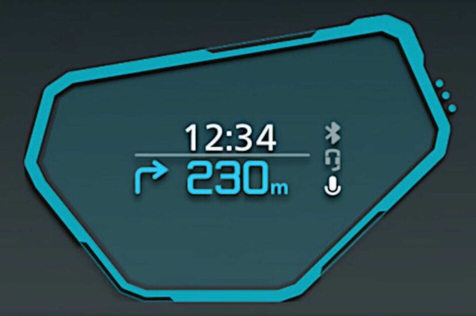 - Projektor maklumat pula diletakkan dalam bahagian pelindung dagu (chinbar) yang memantulkan data tunggangan ke skrin HUD.