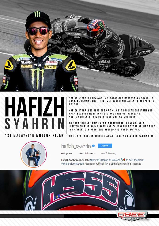 Jangan lepaskan peluang mendapatkan helmet replika edisi terhad eksklusif, Nolan X-Lite N60-5 Hafizh Syahrin pada harga RM1,500 (harga asal RM1,688). Tawaran pra tempahan itu dibuka hingga penghujung Jun ini. Jadi bertindak segera!