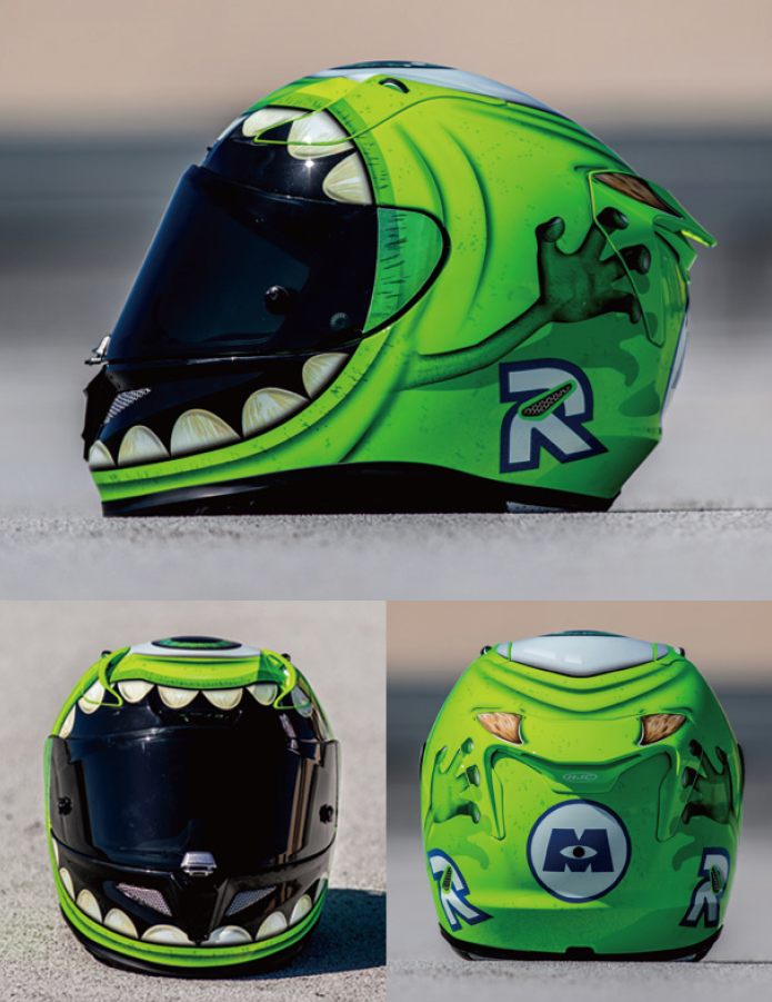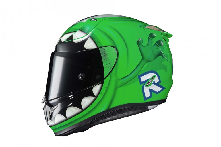 Pada saingan Moto2 dan Moto3 di GP Perancis minggu lalu, kelihat beberapa pelumba menyarung helmet HJC RPHA 11 Mike Wazowski. Juara MotoAmerika 2017, Toni Elias juga akan menggunakan helmet unik ini di litar Laguna Seca pada 23 Jun ini.