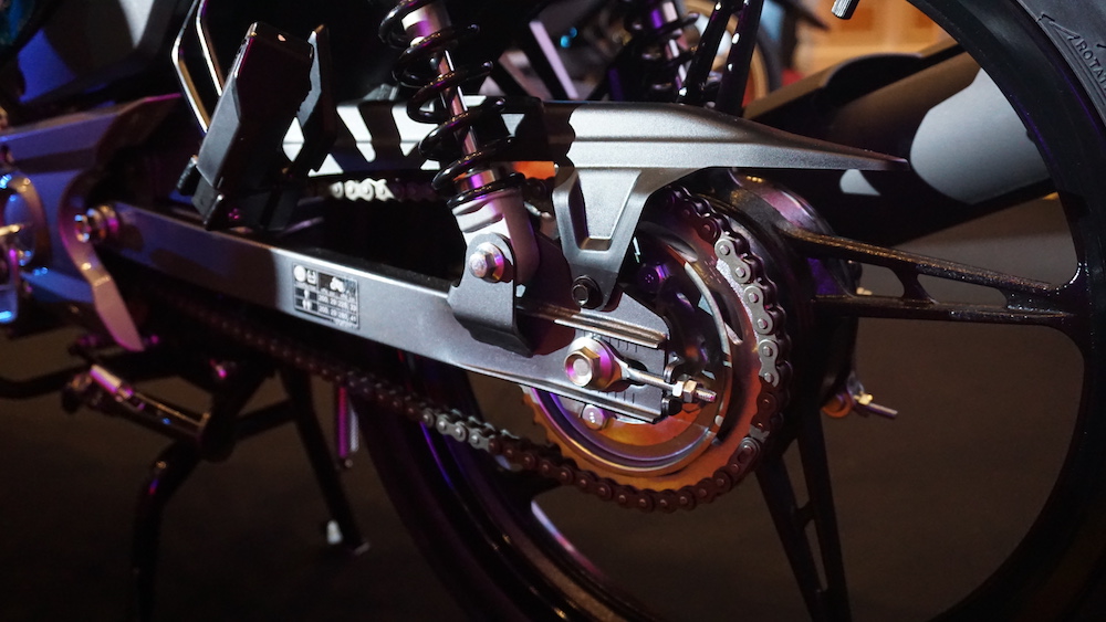 - Sistem suspensi fork konvensional di depan, dan dwi-absorber di belakang.
