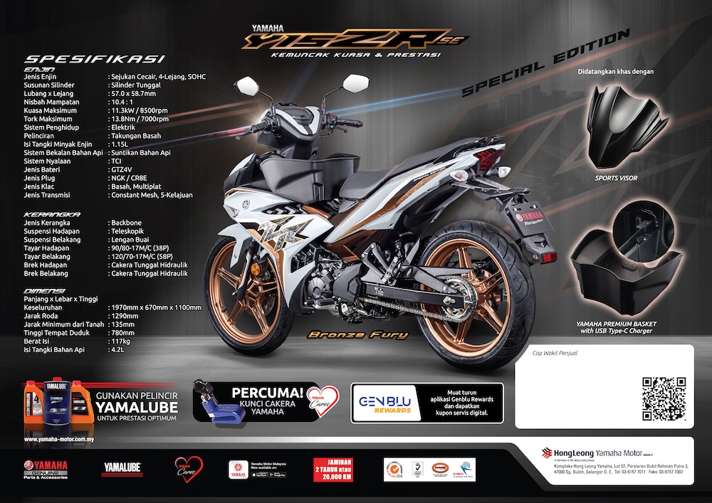Model terbaharu itu didatangkan dengan bakul premium Yamaha dan dilengkapi soket pengecas peranti jenis USB Type-C. Setiap pembelian juga disertakan hadiah alat kunci brek cakera bernilai RM100.