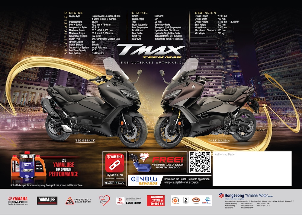 HONG Leong Yamaha Motor (HLYM) mengumumkan tawaran warna dan grafik baharu untuk skuter Yamaha TMax Tech Max edisi 2023 iaitu Dark Magma (tembaga gelap) dan Tech Black (hitam).