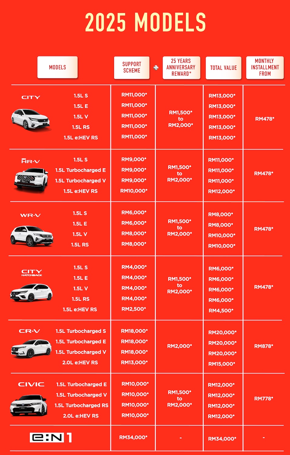 - Program Khas Naik Taraf: Tambahan rebat kepada pembeli yang menaik taraf model Honda baharu, termasuk Proton dan Perodua dengan nilai ganjaran sehingga RM12,500*