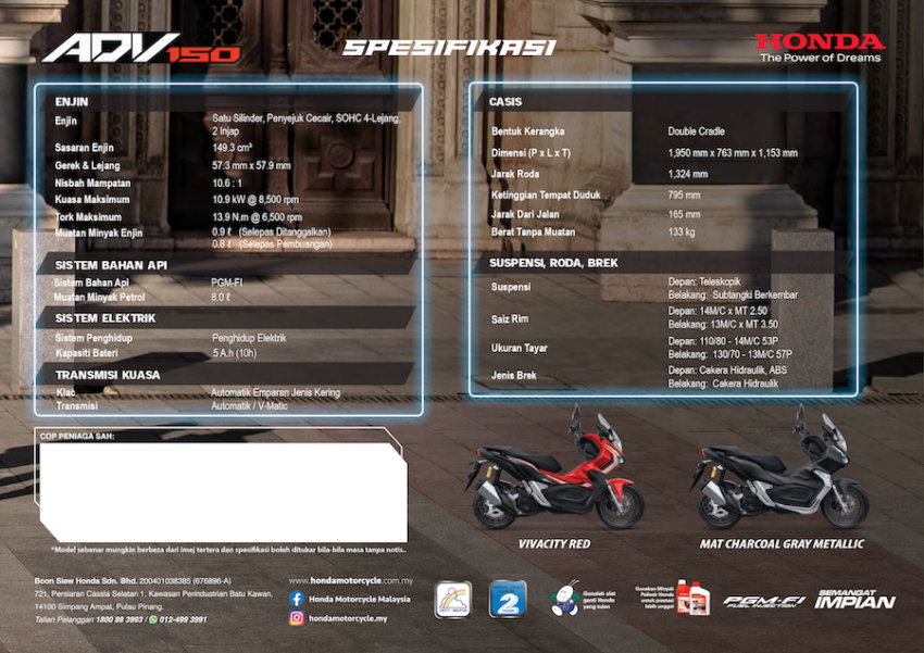 Berikut perincian mengenai ADV 150 (2021) spesifikasi Malaysia: