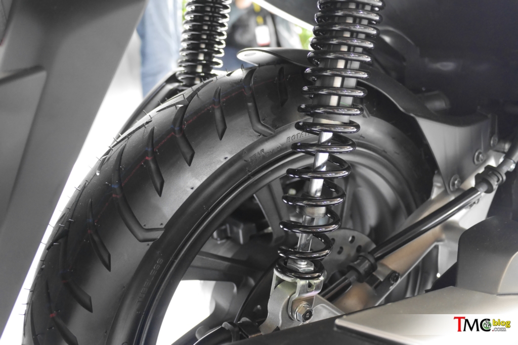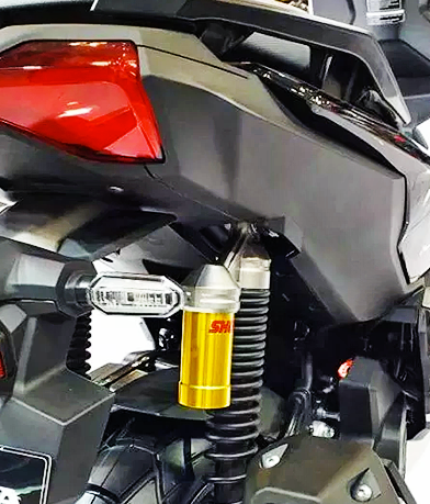 Bermula bentuk lebih panjang dan jarak antara spring yang berbeza regangan, Honda cuba menyesuaikan sistem suspensi belakang ADV 150 untuk menampung pelbagai beban. Kelihatan lekuk atau jalur yang menghubungkan bahagian badan suspensi dengan subtangki.