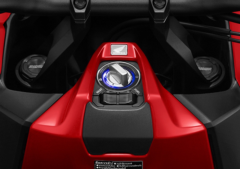 - Kunci pintar Honda Smart Key untuk menghidupkan enjin, membuka pelana dan mengunci automatik tanpa kunci fizikal.