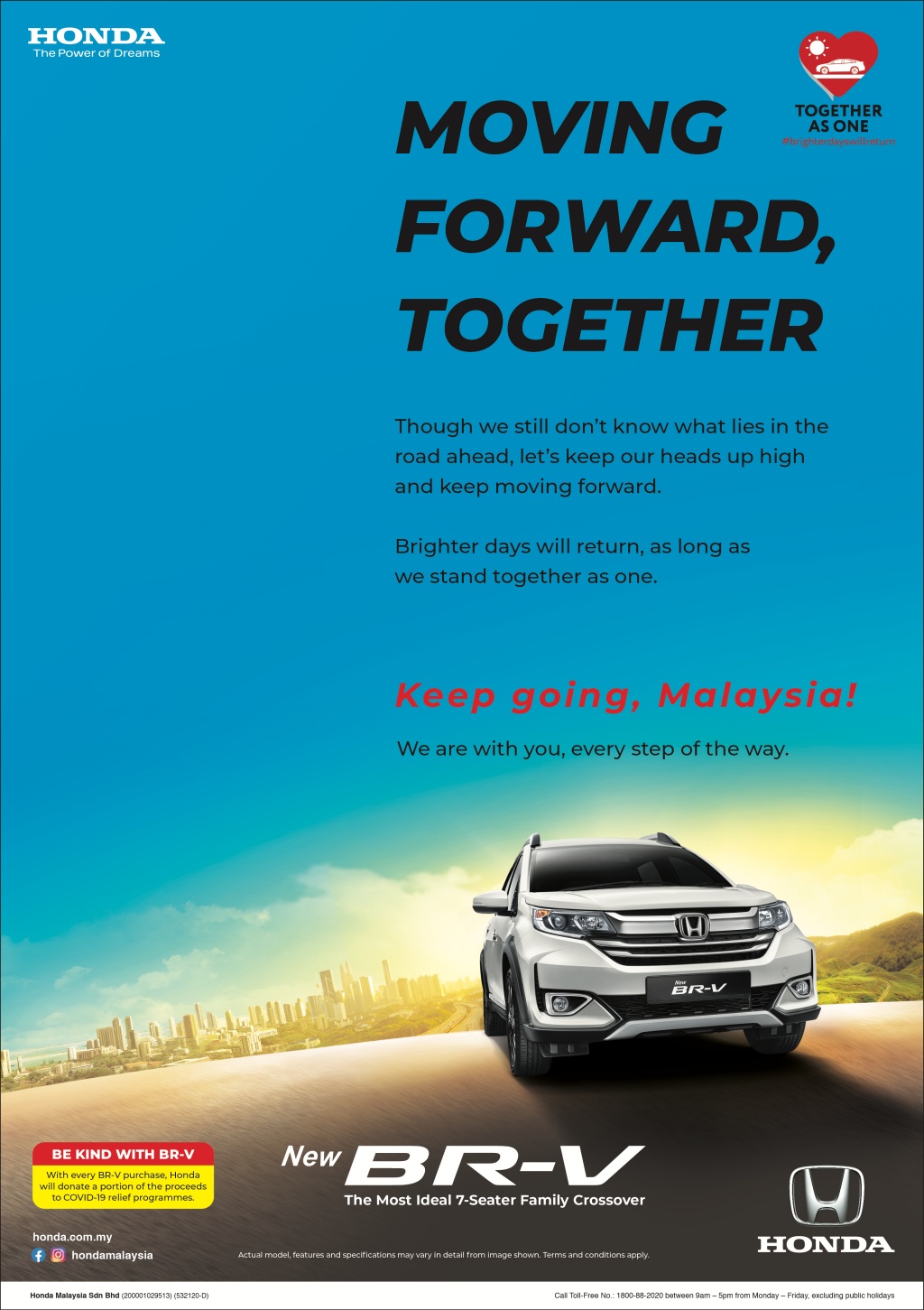 Kempen pertama, ‘Be Kind With BR-V’, bermula 2 Jun hingga 31 Ogos ini yang mana setiap jualan BR-V (2020) facelift akan didermakan untuk bantuan Covid-19.