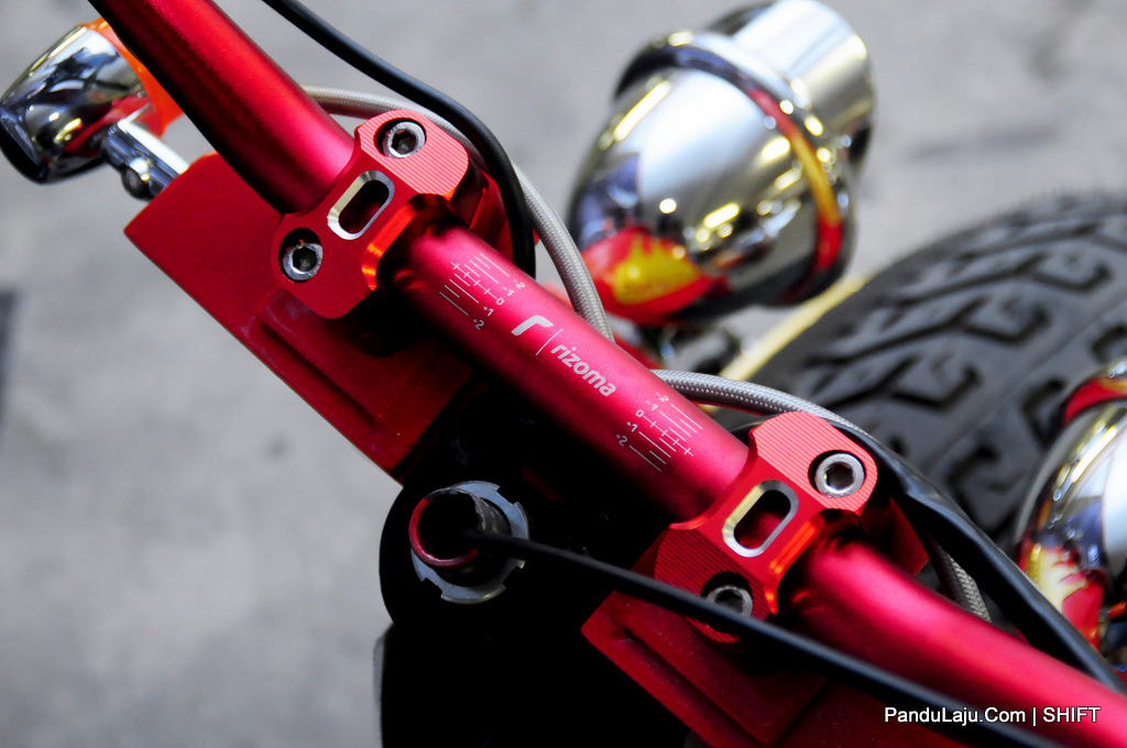 Manakala pemegang basikal jenama Rizoma dipadankan dengan riser buatan kustom bersama pendikit minyak Daytona dan pam brek cakera depan serta belakang. Ruangan brek pula diserahkan kepada kaliper dari Brembo.