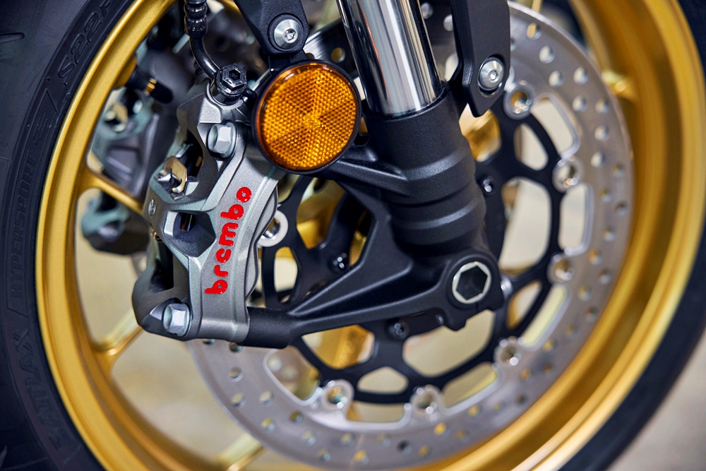 - Depan Brek cakera kembar 310mm dengan kaliper Brembo Stylema 4-piston