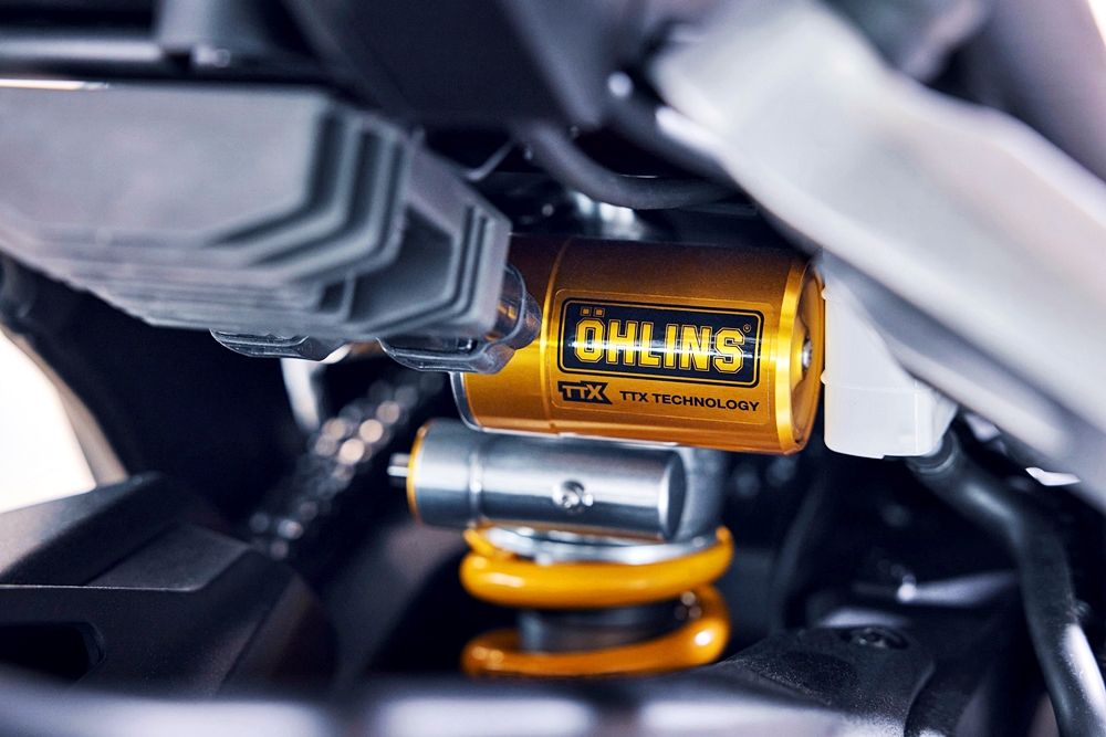 - Belakang Monoshock Öhlins TTX36 boleh laras dengan travel 139mm, dan swingarm Prolink