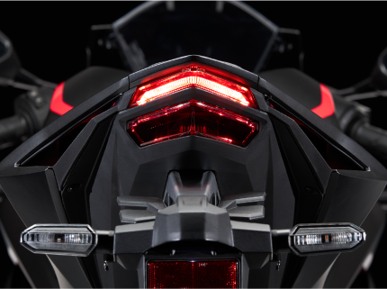Lampu depan direka terperosok ke dalam dengan posisi lampu siang (DRL) di atas, juga mirip CBR250RR. Cuma silenser ekzos masih sama.