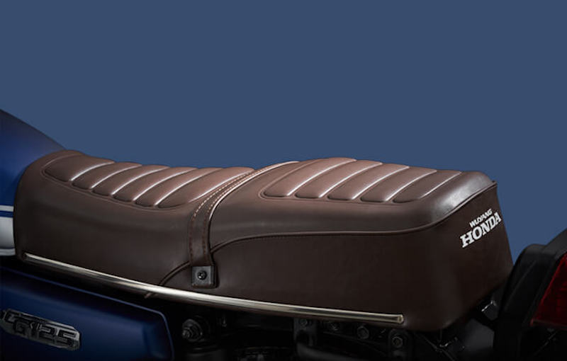- Pelana bercorak dengan balutan material kulit sintetik berwarna coklat gelap dan ada jalur logam berwarna krom dipasang pada sisi pelana. Bagaimanapun, tiada bar pembonceng ditawarkan.