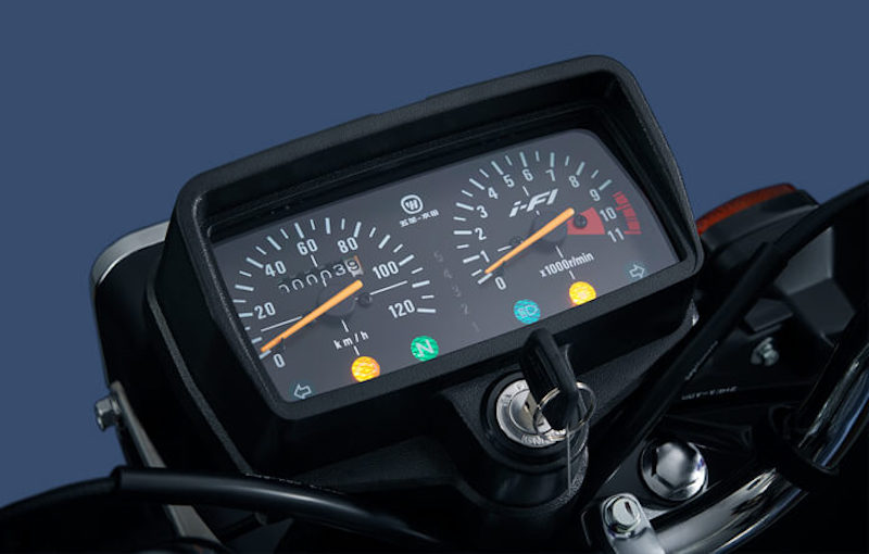 - Instrumen meter CG125 berbentuk segiempat depan paparan meter analog untuk spidometer dan takometer. Beberapa lampu amaran dipasang pada bahagian bawah meter.