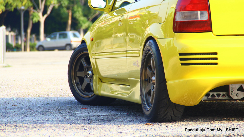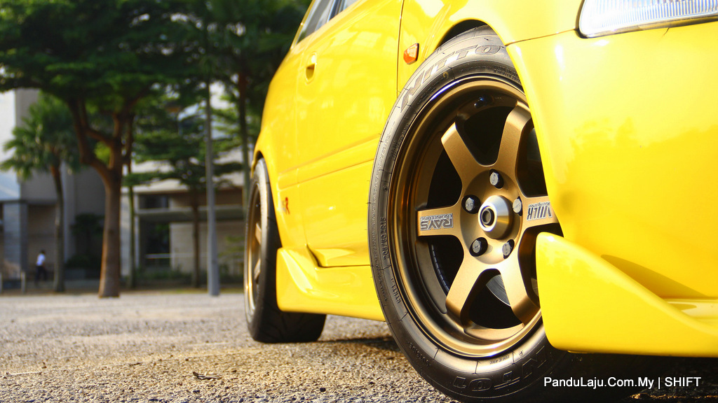 RODA Volk Racing TE37 15x8jj offset +27 (depan) 15×6.5jj offset +25 (belakang), tayar Nitto NT01 205/50R15 (depan) Toyo Proxes R888 195/55R15 (belakang)