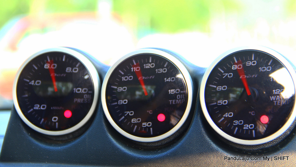 Deretan meter Defi ‘oil press’, ‘oil temp’ dan ‘water temp’ memenuhi segenap ruang papan pemuka yang berperanan membantu pemandu memantau keadaan enjin dengan lebih mudah.
