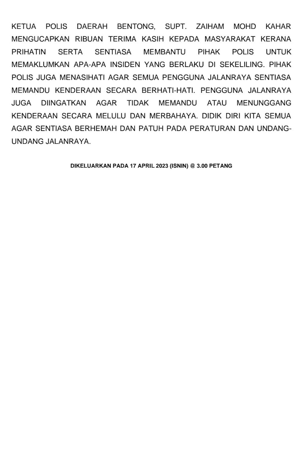 Menurutnya, insiden berlaku pada Ahad lalu (16 April) kira-kira jam 7.25 pagi di KM14.6 Jalan Genting Highlands di Bentong, Pahang. Beliau berkata;
