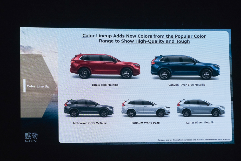 Ada lima warna ditawarkan, iaitu Ignite Red Metallic (merah), Meteoroid Gray Metallic (kelabu), Lunar Silver Metallic (perak), Canyon River Blue Metallic (biru) dan Platinum White Pearl (putih).
