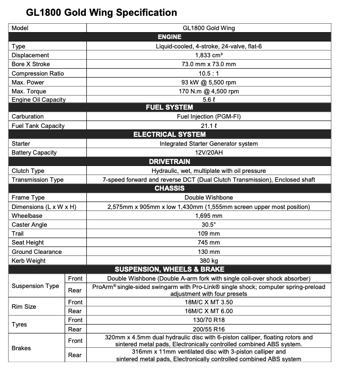 FAKTA RINGKAS GL1800 GOLD WING (2020):