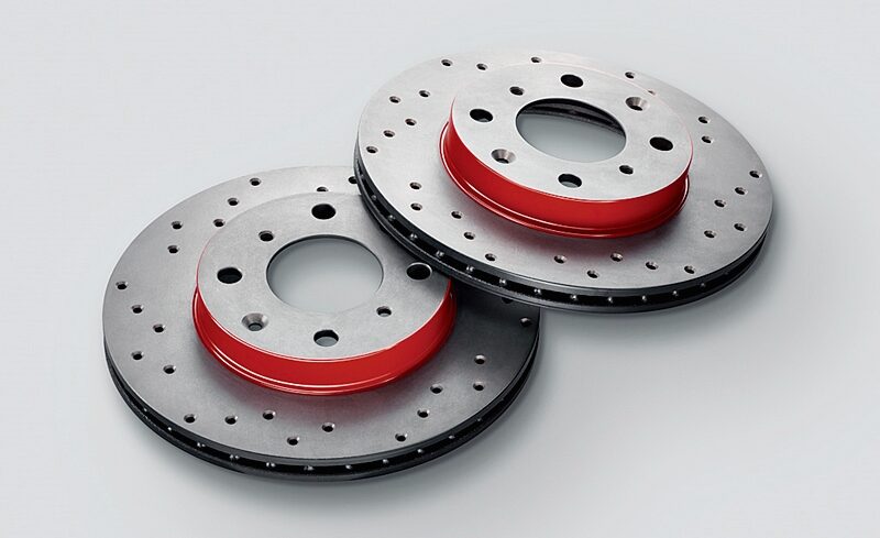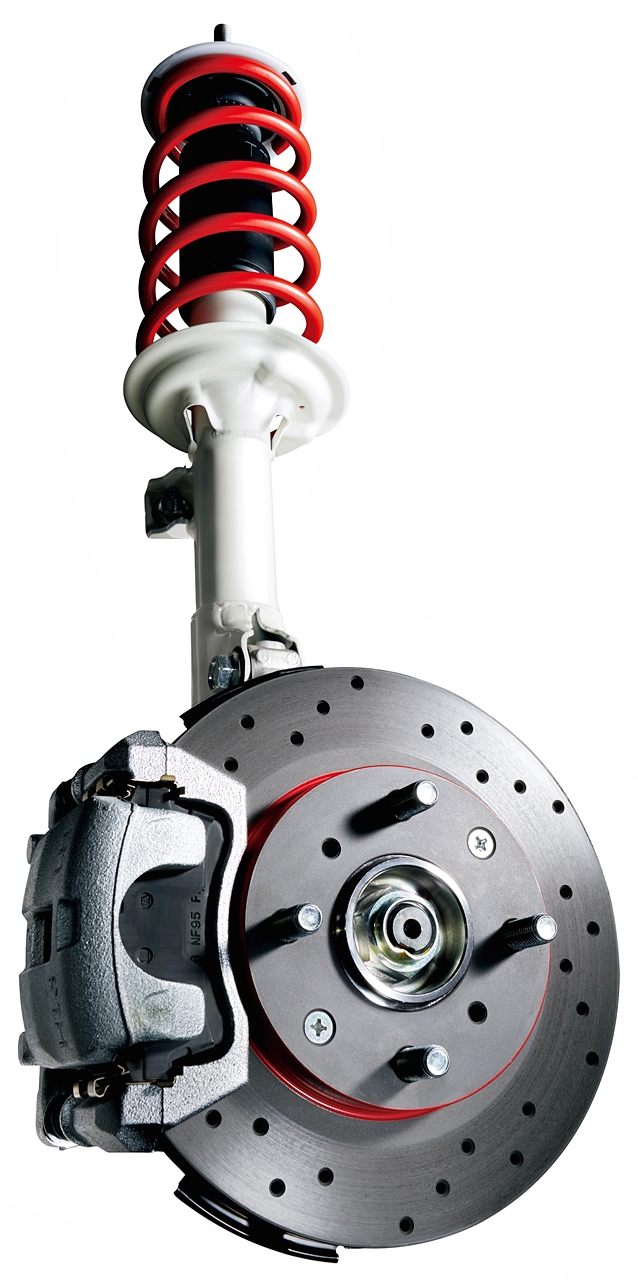 - Cakera brek dengan liang untuk alihan haba dan habuk geseran.