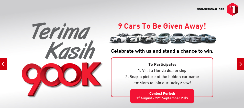 HONDA Malaysia melancarkan kempen ‘900,000th Unit Milestone Campaign’ dengan menawarkan 9 model Honda untuk dimenangi. Pelancarkan kempen ini adalah sempena meraikan pencapaian jualan 900,000 unit kenderaan Honda di Malaysia pada suku ketiga tahun ini.