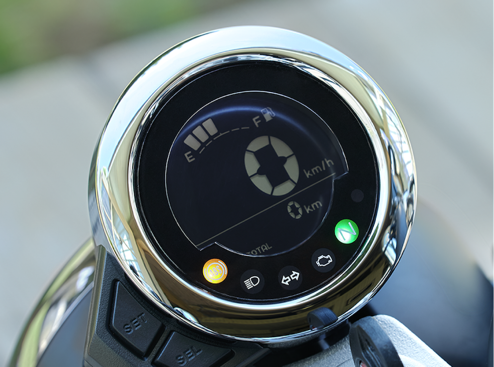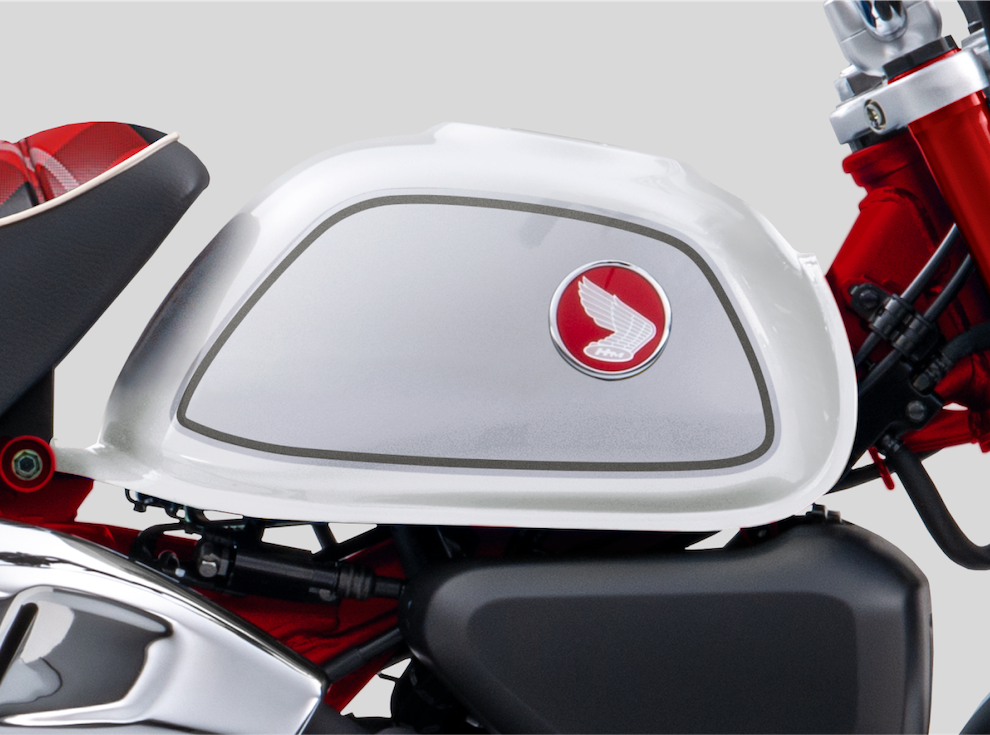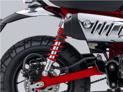 Tiga warna kuning, merah dan hitam nampak menyerlah dengan frem yang dibuat dalam warna sama, termasuk absorber depan dan belakang. Pelana corak kotak pula mengingatkan kepada model terdahulu, Honda Z50M.