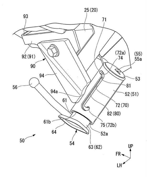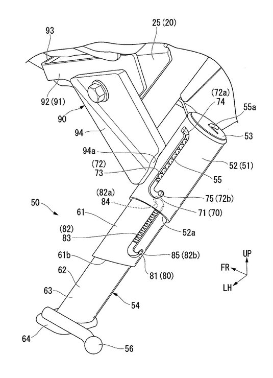 Berdasarkan gambarajah paten di atas, sistem pengunci tongkat sisi Honda itu menggunakan cangkuk berspring yang boleh diturun naikkan. Mekanisme cangkuk berspring beroperasi menerusi alur kecil pada tongkat, seakan saluran parit, yang akan menahan posisi batang tongkat. Cara mengunci pengunci pula adalah dengan memusingkan tuil (no 56) di hujung bawah tongkat.