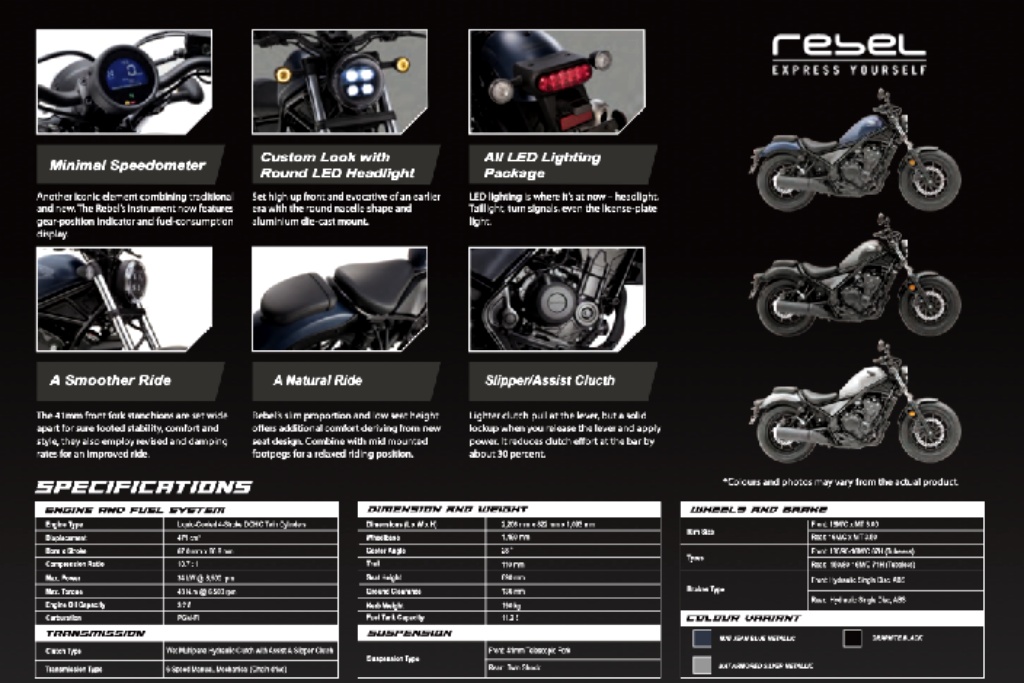 Panel spidometer berbentuk bulat kompak dengan lampu latar putih yang memaparkan, maklumat bahan api dan indikator posisi gear yang tiada pada Rebel terdahulu. Bahagian roda menggunakan rim 16 inci dan tayar 130/90 di depan dan 150/80 (belakang).