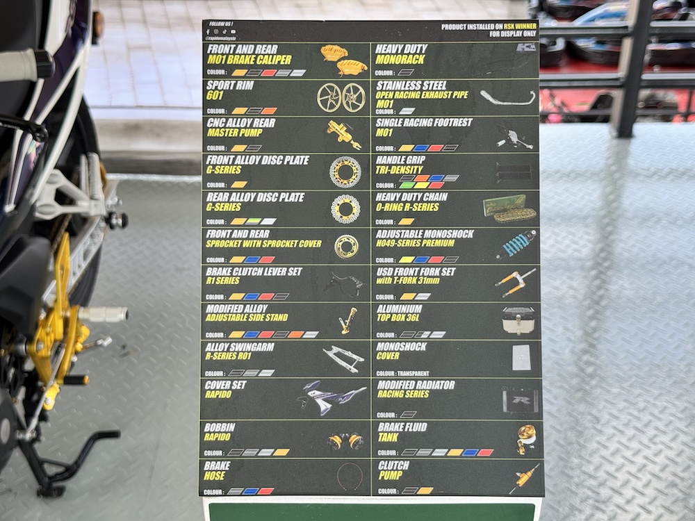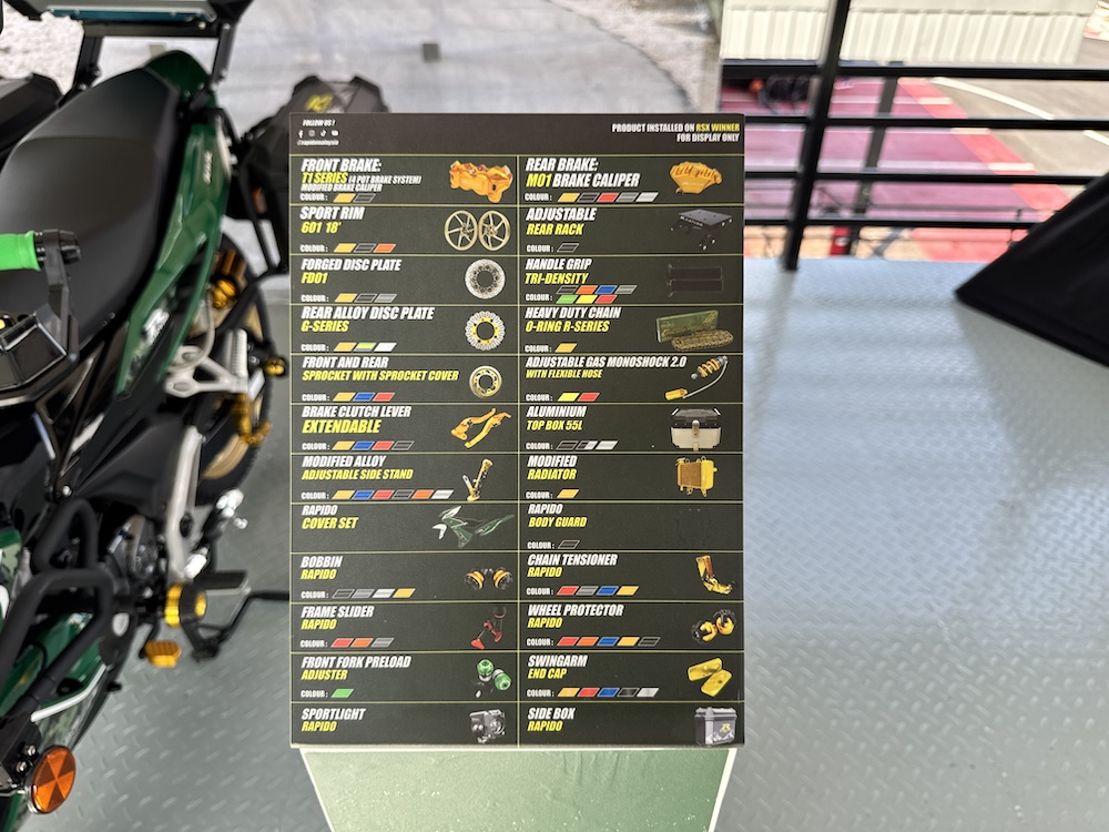 Pameran koleksi motosikal itu menggunakan komponen aftermarket membabitkan jenama popular di Malaysia, Rapido dan RCB. Tiada senarai harga atau kos didedahkan untuk keseluruhan naik taraf setiap model yang dipamerkan.