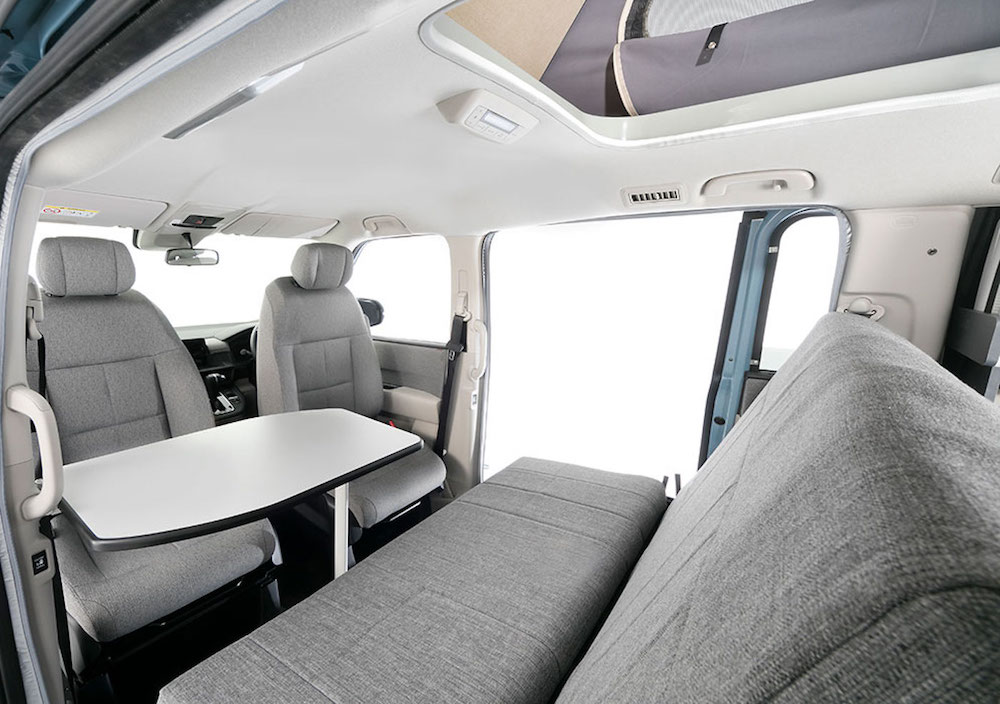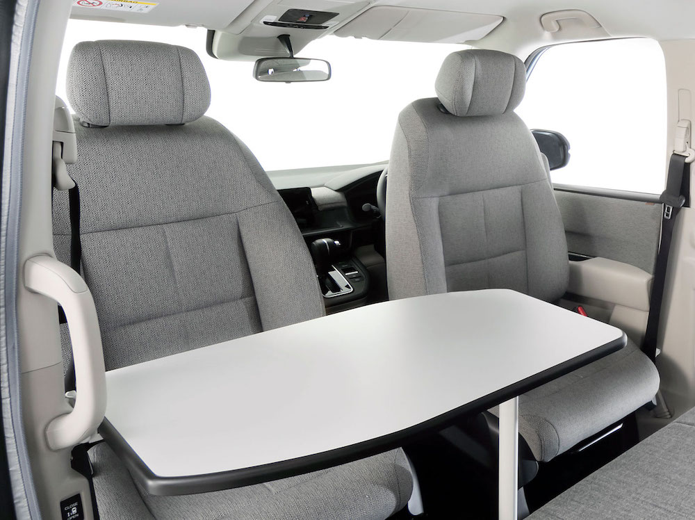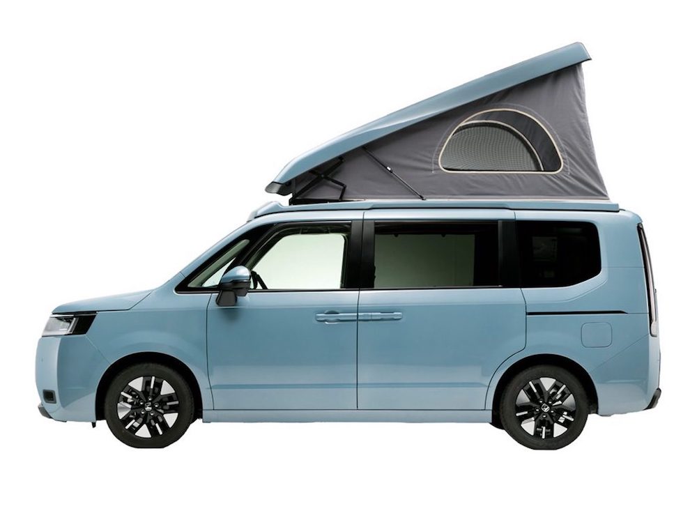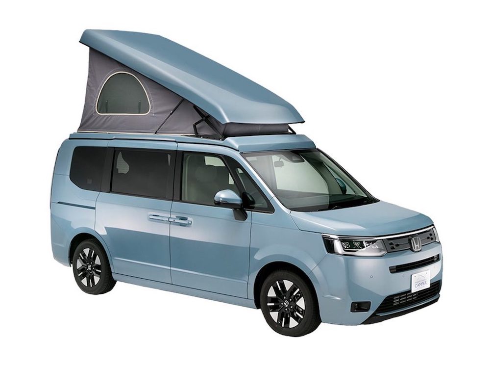 Van mini generasi keenam Honda Step WGN dengan tiga barisan tempat duduk itu diubah suai dengan tambahan bumbung jenis pop-up, dan tempat duduk swivel (boleh pusing) yang lengkap dengan ruang memasak kecil.