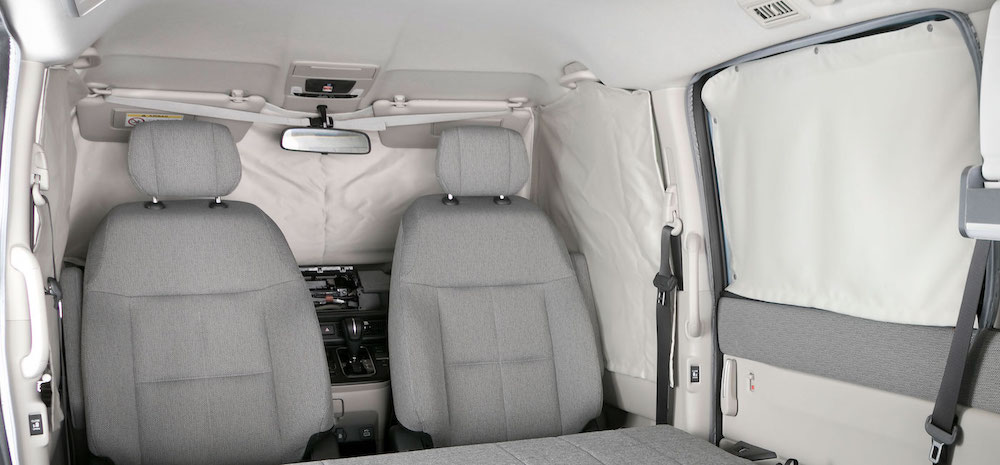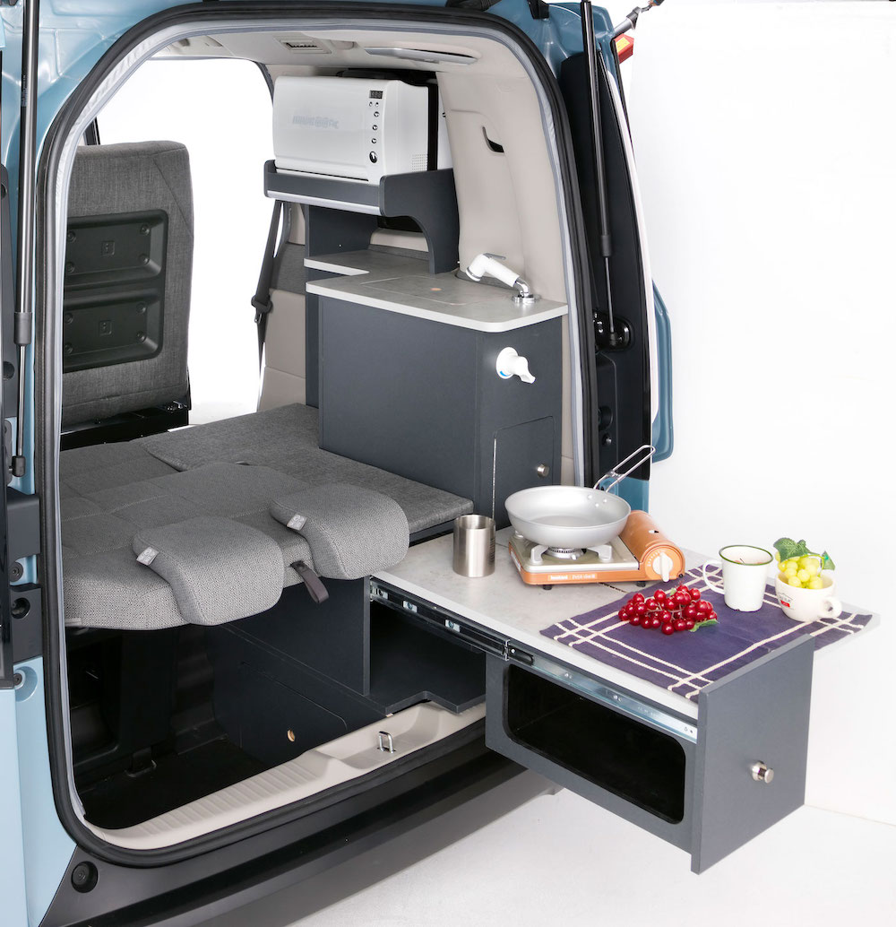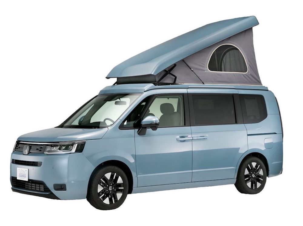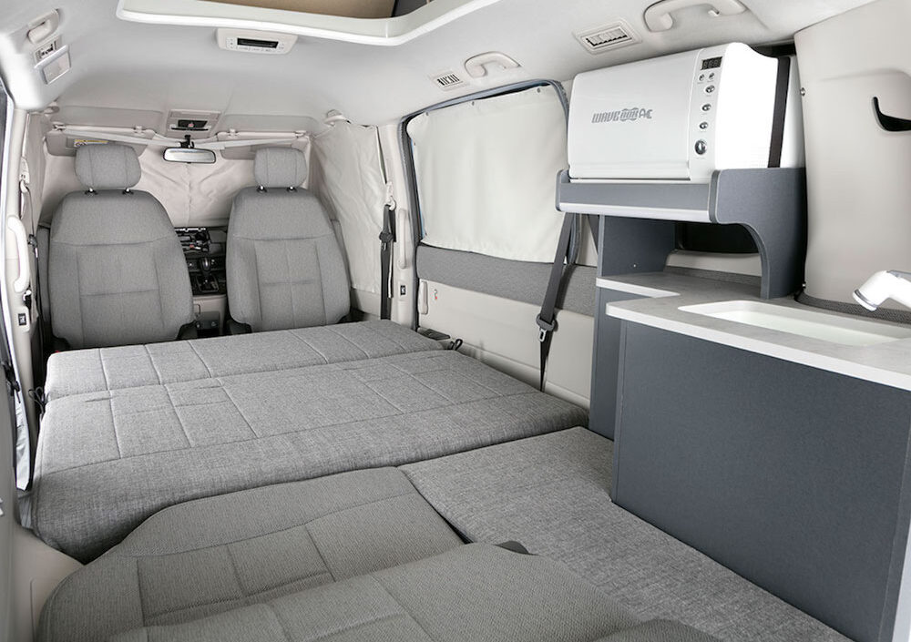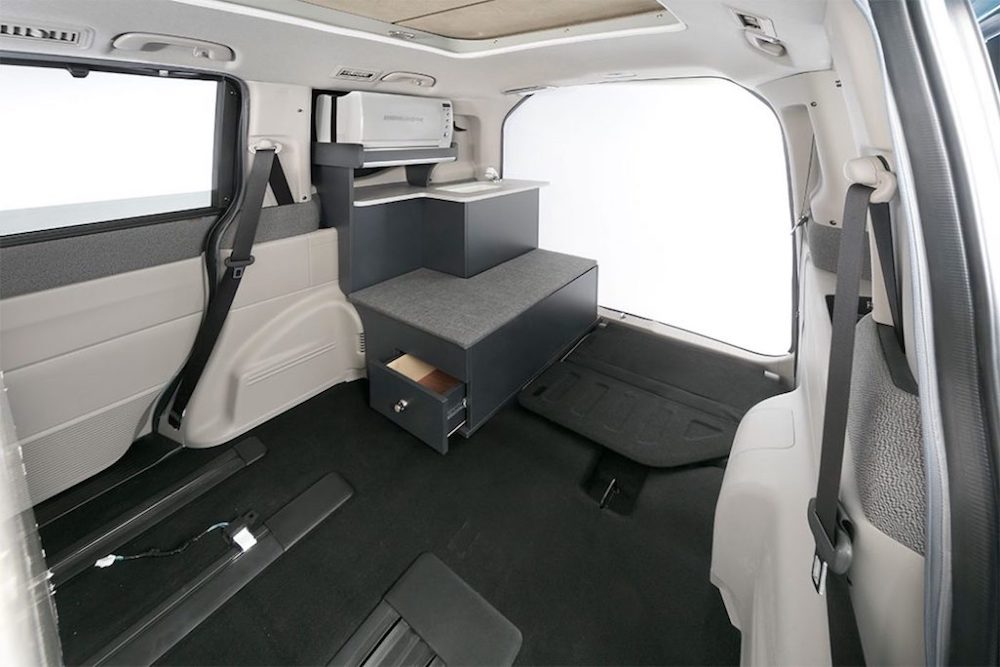 Van mini generasi keenam Honda Step WGN dengan tiga barisan tempat duduk itu diubah suai dengan tambahan bumbung jenis pop-up, dan tempat duduk swivel (boleh pusing) yang lengkap dengan ruang memasak kecil.